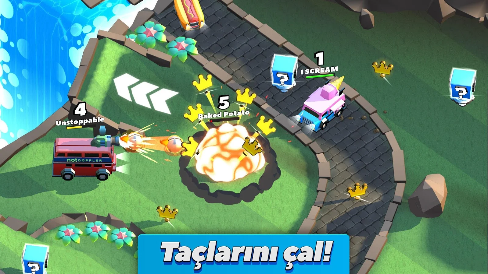 Crash of Cars'ın güzel yönü ise oyunun online altyapıya sahip olması. Oyundaki multiplayer karşılaşmalarda birçok oyuncu bir araya geliyor. Oyundaki temel amacımız ise rakiplerimizin araçlarını yok edip parçalayarak taçları toplamak ve maç sonunda en çok taca sahip olan yarışmacı olmak. Tabi sizin buna ihtiyacınız yok zaten sınırsız para hileniz olacak :).